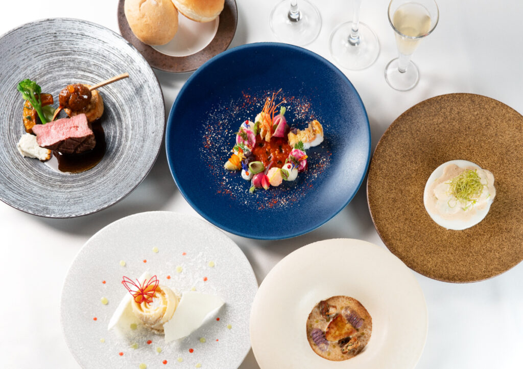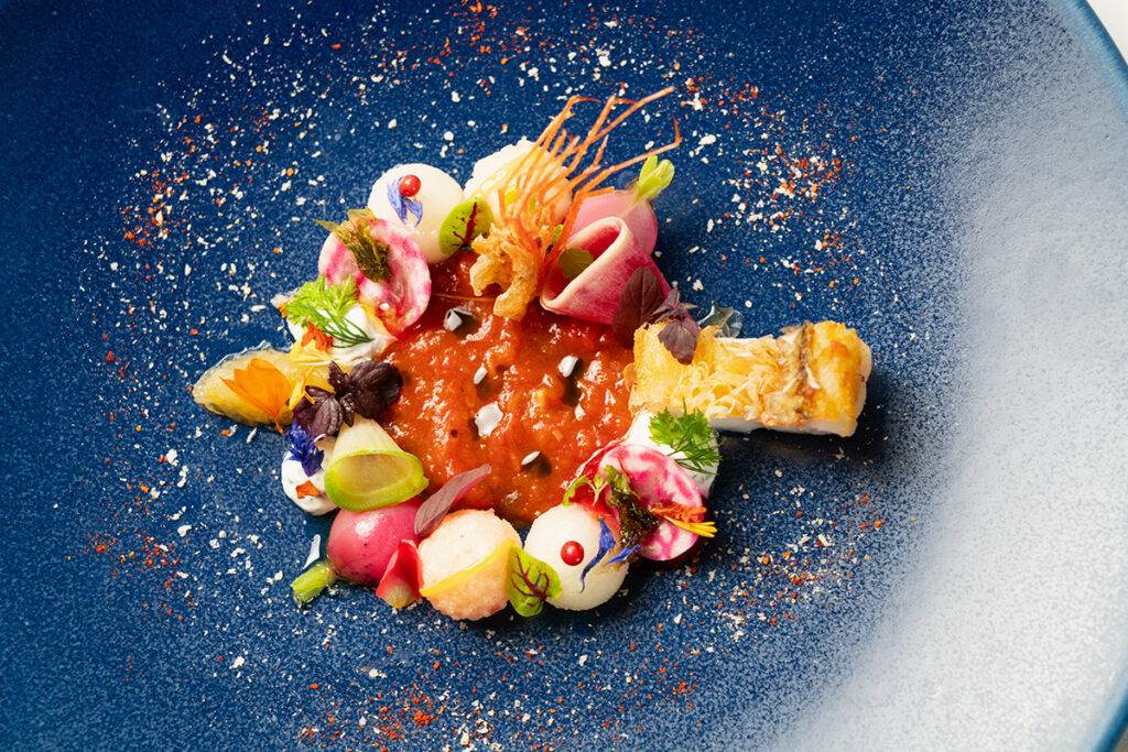 甘鯛の鱗焼きを主役に、甘海老とイカのブーレット、梨とビーツなどで彩り、柚子香るトマトフォンデュと大葉オイルで仕上げた冷製オードブル。