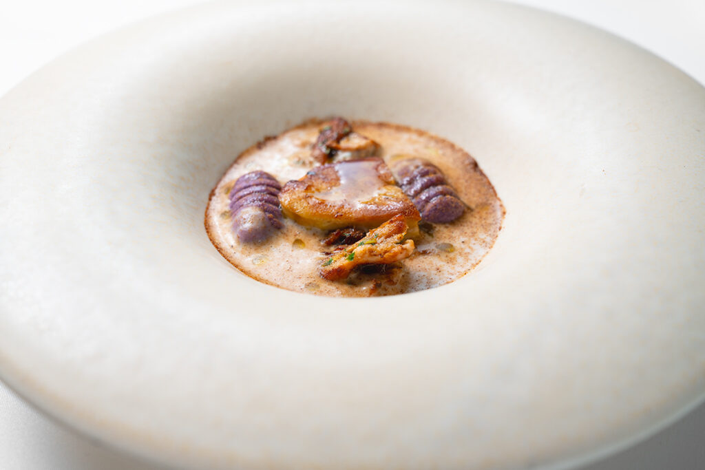 Crème de châtaigne avec gnocchis de patate douce violette et foie gras