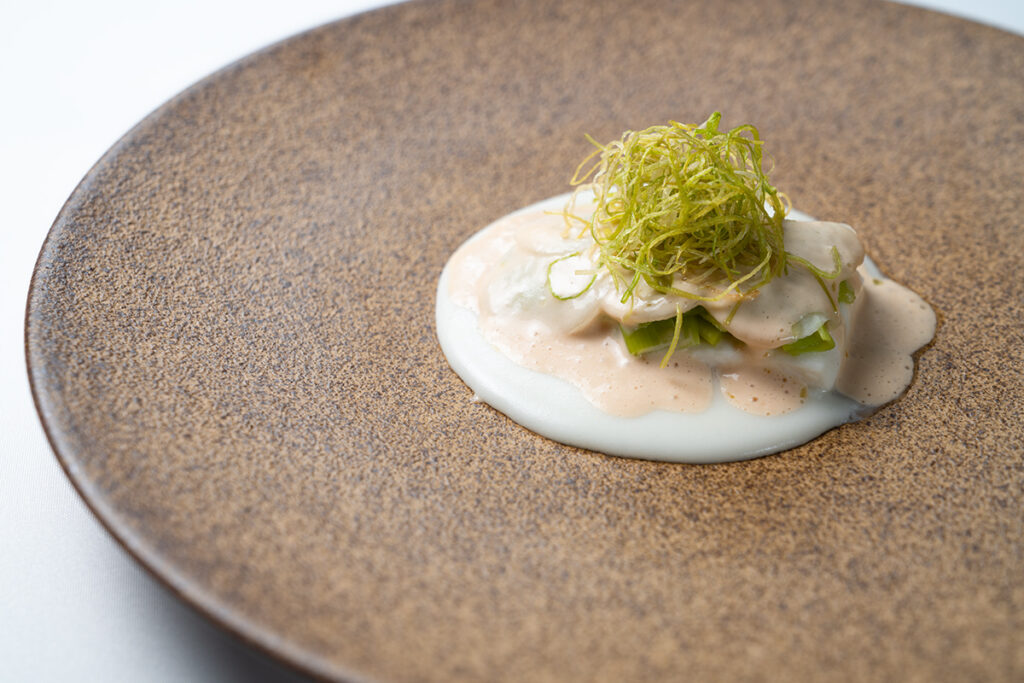 ポロ葱とカブラを重ねた平目を繊細に蒸し上げ、福井県小浜市産の雲丹醤を加えたクリームソースで香り高く仕立てました。百合根のピューレが優しい甘みと余韻を添える一皿。