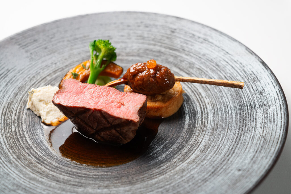 牛フィレ肉のグリエ 飴色玉葱のパンペルデュとスパイシーなソーセージと共に