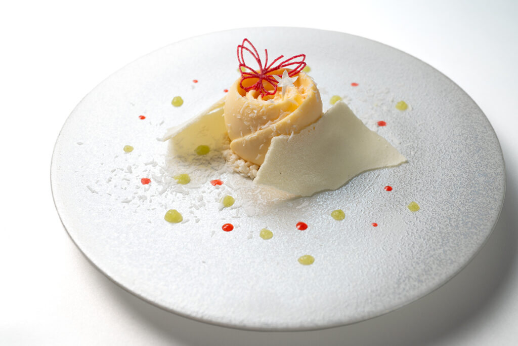 イチゴムースをホワイトチョコレートムースで包み、ホワイトチョコレートのメレンゲとライムソースでまとめたデザート。