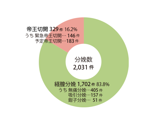 2021年の分娩件数は2,007件、無痛分娩は130件、帝王切開は393件でした。